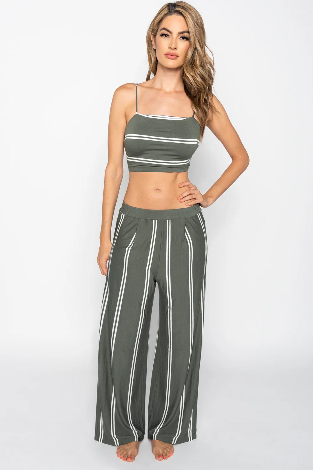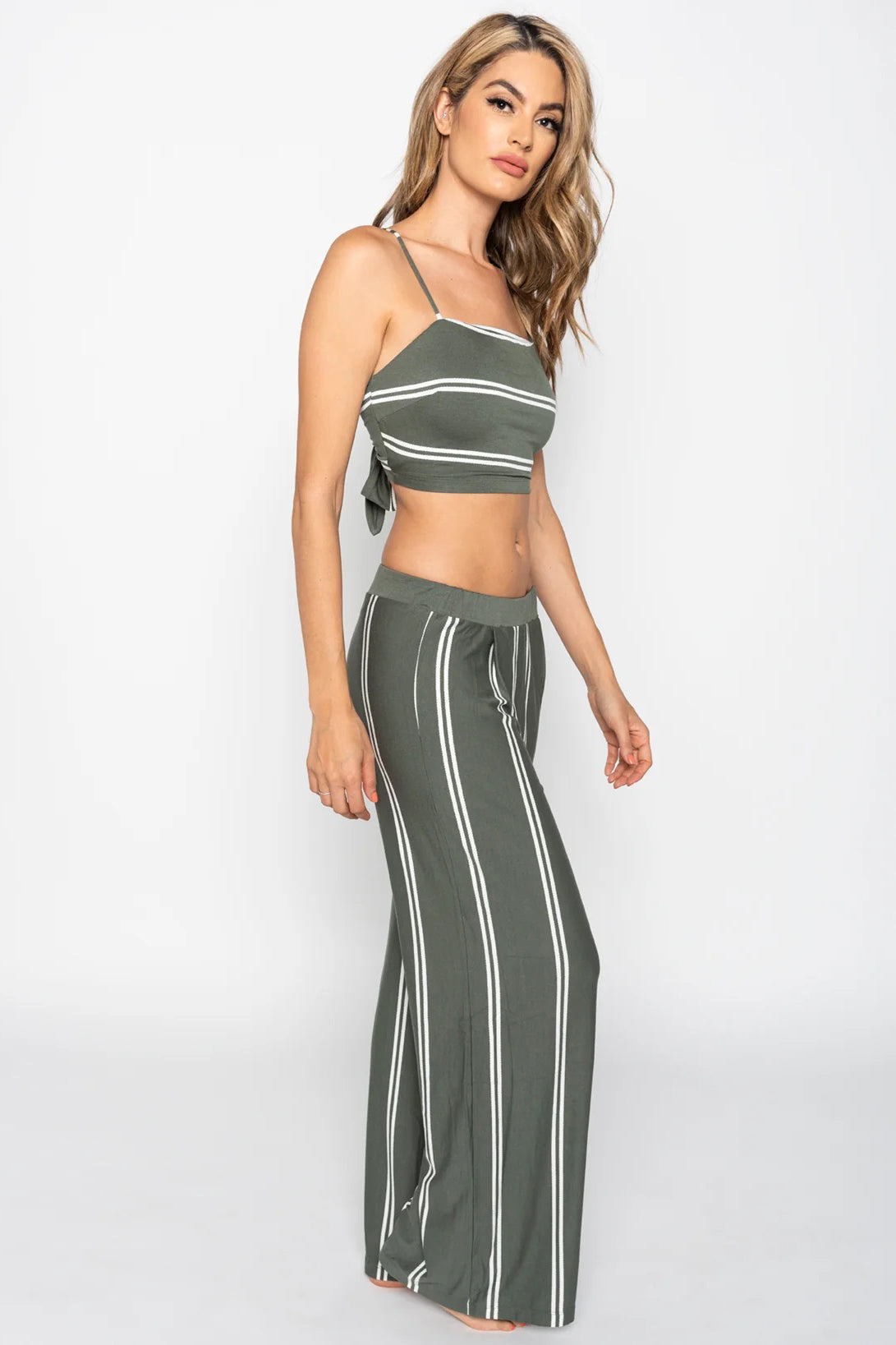 Say hello to your new vacation uniform! This olive green striped resort set is the definition of chic meets carefree. Featuring a flirty tie-back crop top with adjustable spaghetti straps and perfectly paired wide-leg pants, this duo was made for poolside lounging, sunset cocktails, and everything in between.
