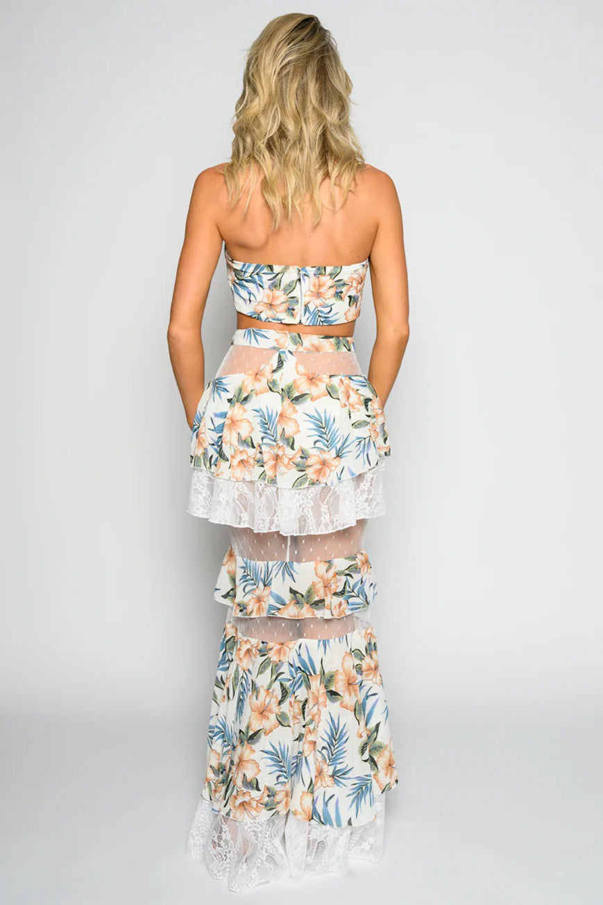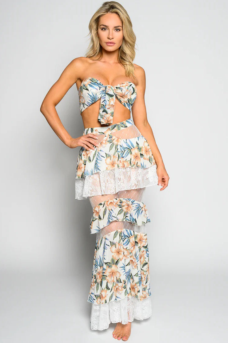 Bring the tropics with you wherever you go in this two-piece floral resort set that’s as dreamy as a sunset cocktail. The strapless tie-front crop top adds a flirty twist, while the flowy tiered maxi skirt steals the spotlight with sheer lace panels and ruffled details that move with every step. The soft hibiscus print in warm peach and green makes this set a natural for beach vacations, pool parties, and resort getaways.