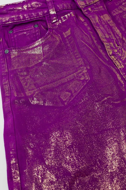 Step out in style with these magenta jeans featuring a shiny metallic gold sheen. The wide, flared legs add a fun, retro vibe perfect for party nights. Designed with a high waist and ankle-length cut, they offer a relaxed fit that feels comfy yet chic. Made from sturdy, non-stretch denim, they come with five classic pockets and a zip closure. Model wears size S — true to size for easy selection.